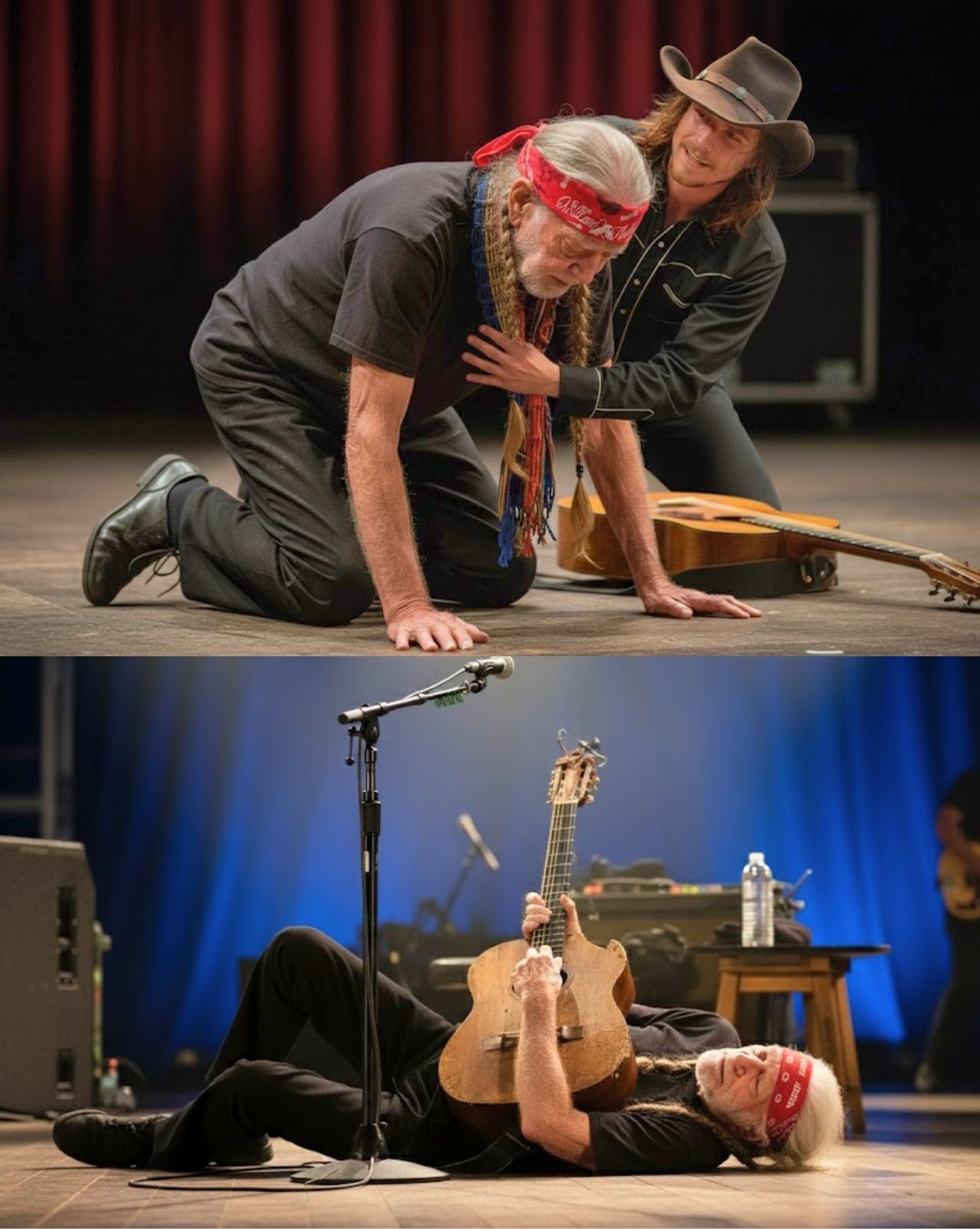 Then, as thousands looked on, Willie Nelson, now 92 years old, slowly sank onto a stool. The audience gasped, hearts stopping mid-beat. Paramedics near the wings began to move, but Willie — ever the cowboy, ever the poet — lifted his hand and motioned for them to stay back.