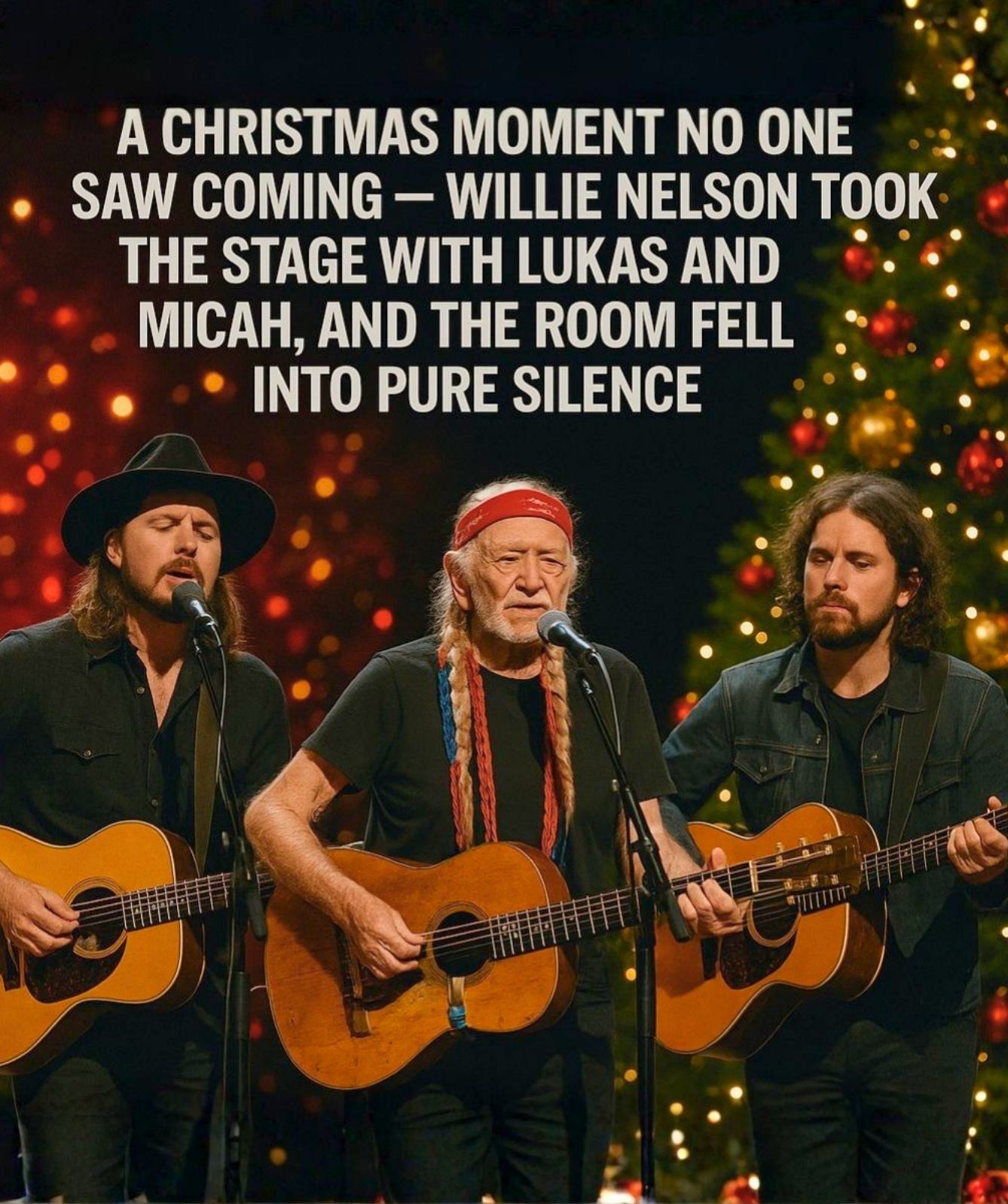 Three silhouettes emerged from the shadows and stepped into the soft Christmas glow. Willie Nelson stood in the center, worn braids resting against his shoulders, his presence calm and unassuming. At his sides were his sons, Lukas and Micah, not behind him, not following — but standing with him.