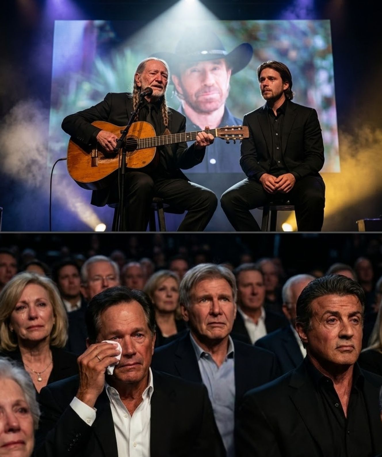 In the shadows, familiar faces stood not as icons, but as individuals carrying their own quiet sorrow. Sylvester Stallone lifted a hand to his face, his composure slipping just enough to reveal the depth beneath. Harrison Ford looked down, as if searching for steadiness in the floor itself. And George Strait, a man known for his calm presence, stood completely still — tears falling without hesitation, without attempt to hide them.