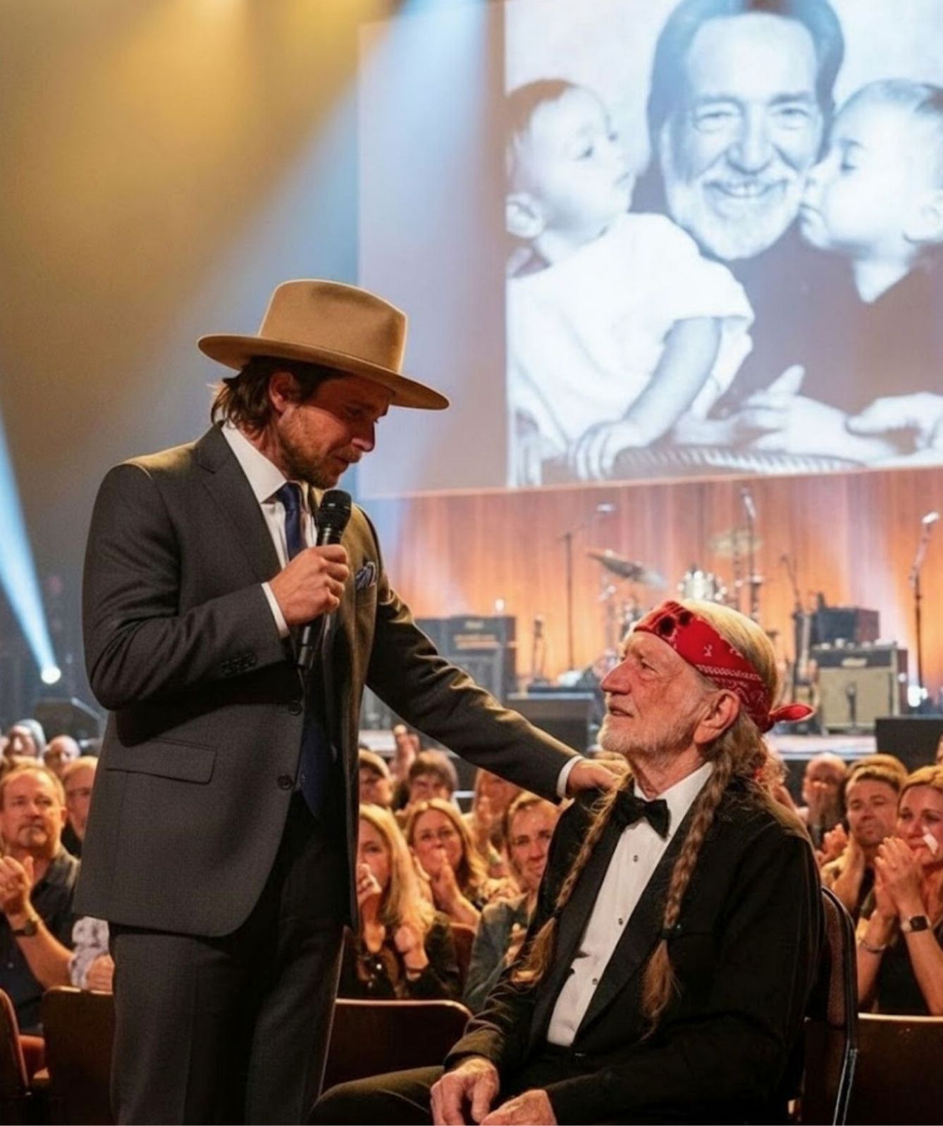 Willie did not rush the stage. He did not make a grand gesture. He simply remained seated, absorbing the moment — a father hearing his own history carried forward with gratitude.