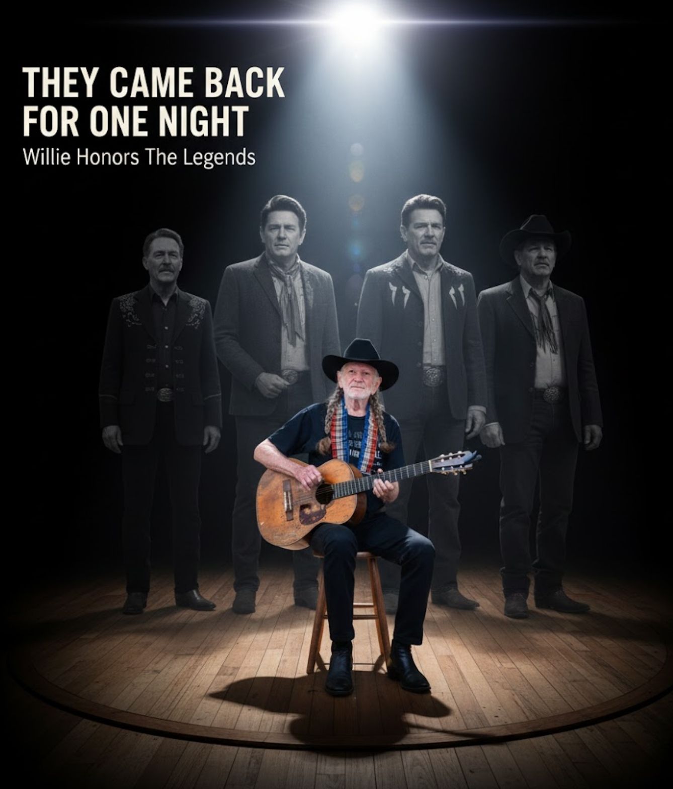 Willie’s guitar rang with a deeper resonance, the strings vibrating with a kind of truth that age cannot dim. Listeners described chills so sharp they felt electric — goosebumps that refused to fade, even long after the last chord faded into the dark. Some said they could almost see shapes in the footlights, as though Hank’s hat tipped, Johnny’s stance appeared broad and steady, and Waylon’s unmistakable silhouette leaned into the glow.