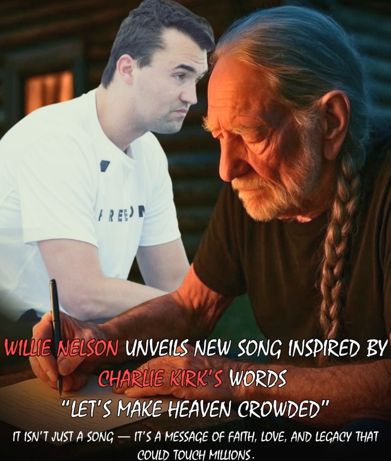 At 92 years old, Willie Nelson has done something that feels almost impossible — he has released a song so intimate, so spiritually charged, that it transcends age, politics, and even time itself. The song, inspired by Charlie Kirk’s simple yet stirring phrase, “Let’s Make Heaven Crowded,” arrived quietly, without promotion or press. Yet its impact has been immediate and profound.
