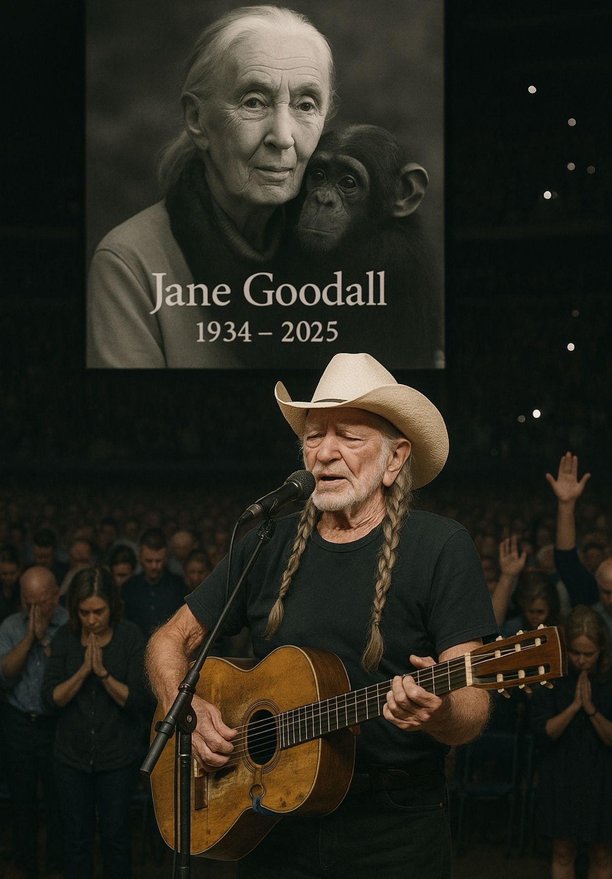 In front of 20,000 silent hearts, Willie Nelson stepped into the spotlight, his familiar guitar cradled close. The stage, usually a place of celebration, became a sanctuary of remembrance. The passing of Jane Goodall at the age of 91 weighed heavy over the gathering, and Willie — with his long braids, weathered face, and humble presence — transformed music into prayer.