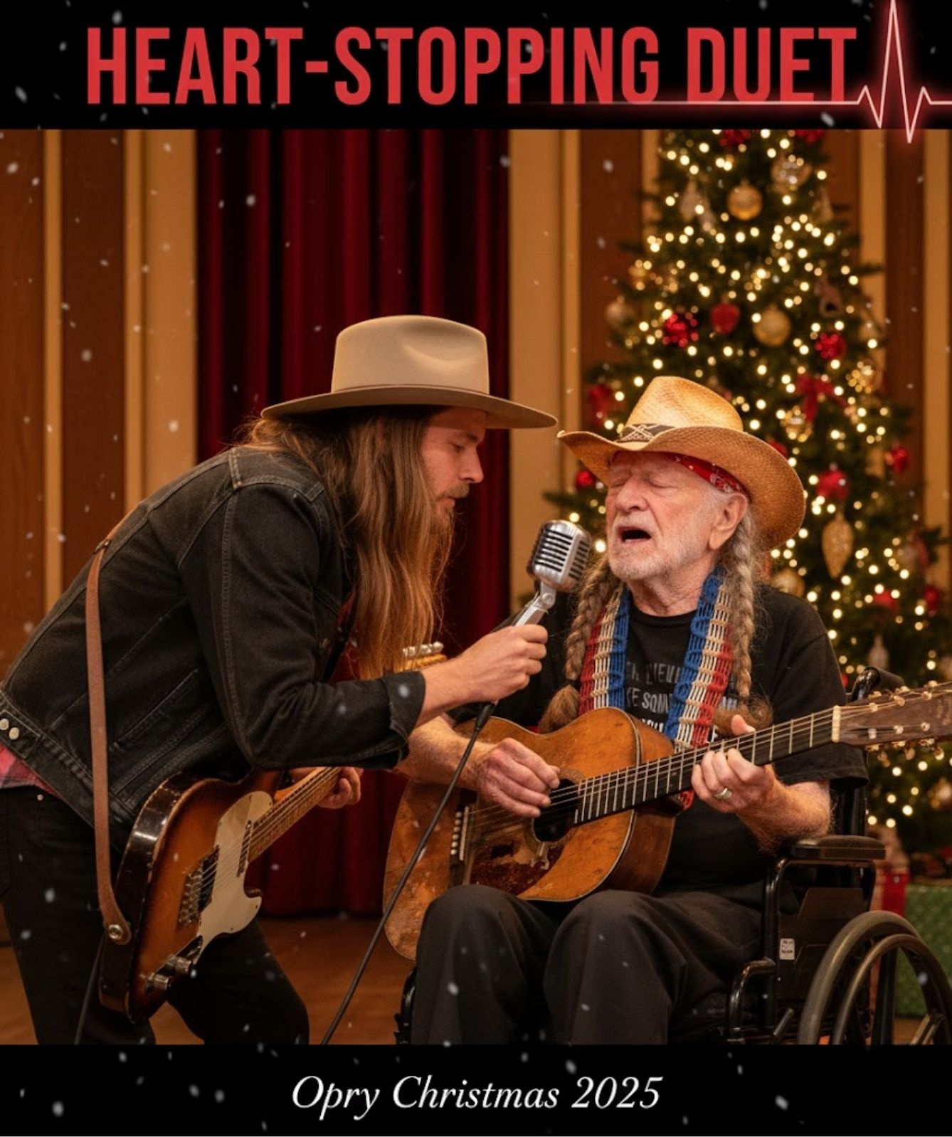 On a hushed Christmas night in 2025, inside the sacred circle of the Grand Ole Opry, one of those moments unfolded — quietly, reverently, and with a power no one in the room was prepared for. Surrounded by country music’s most revered figures, Willie Nelson stepped into the light with his son Lukas, and together they offered a duet that felt less like a song and more like a passing of the soul itself.