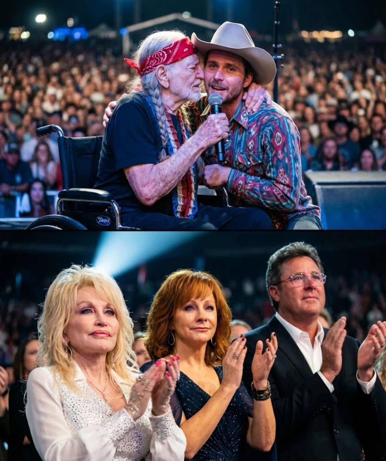 Just before midnight, away from the lights and the waiting crowd, Willie Nelson leaned close to his son, Lukas Nelson. Witnesses nearby would later say Willie’s voice was barely above a whisper — not advice, not instruction, but a blessing. The kind only a father gives when words have been earned over a lifetime.