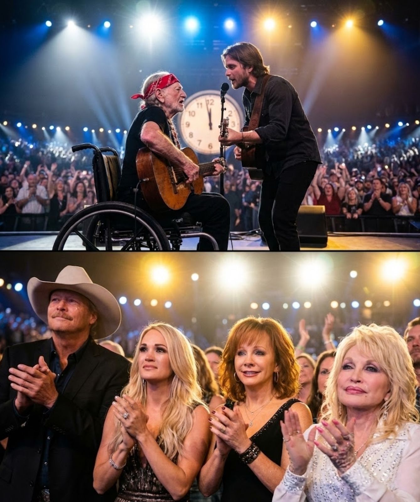 At the center of the stage stood Willie Nelson, his arm around his son Lukas Nelson, surrounded by friends and fellow legends who understood instinctively that something sacred was unfolding. The countdown paused not because of error or spectacle, but because music chose the moment.