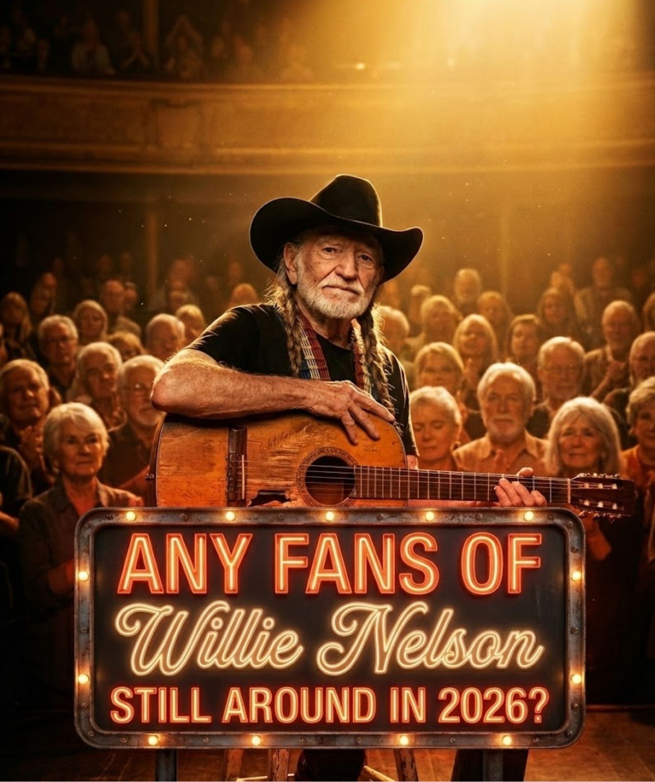 Gray hair shimmered faintly in the soft glow. Faces lined not only by age, but by years of living — marriages, losses, children raised, parents buried, long highways traveled with Willie’s voice humming through car radios. These were not casual listeners chasing a trend. They were witnesses to a lifetime of music. And as the lights settled, they fell into a silence so complete it felt almost sacred.