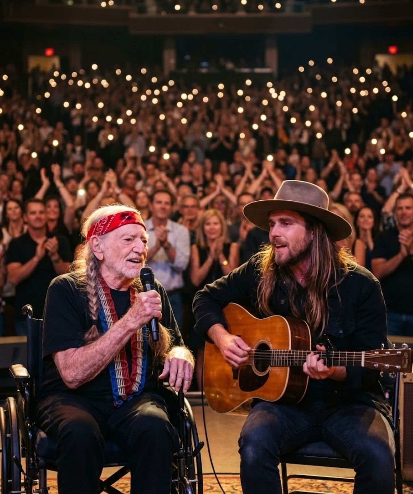 What followed was not merely a duet. It was a living conversation between past and future, spoken in melody rather than words. Willie’s voice—weathered, braided with decades of roads traveled and songs survived—did not overpower Lukas’s. Instead, it wrapped around him, like endless Texas horizons at sunset, wide and forgiving, carrying history without demanding attention.