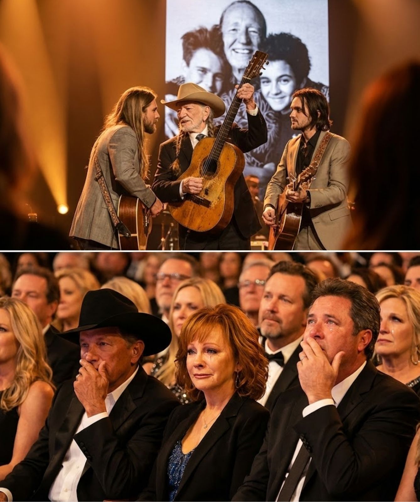 Just as Willie struck the first chord, two familiar figures emerged from the shadows. Lukas Nelson and Micah Nelson walked onto the stage — not with fanfare, not with introduction — but with quiet certainty. They did not interrupt the moment. They entered it.