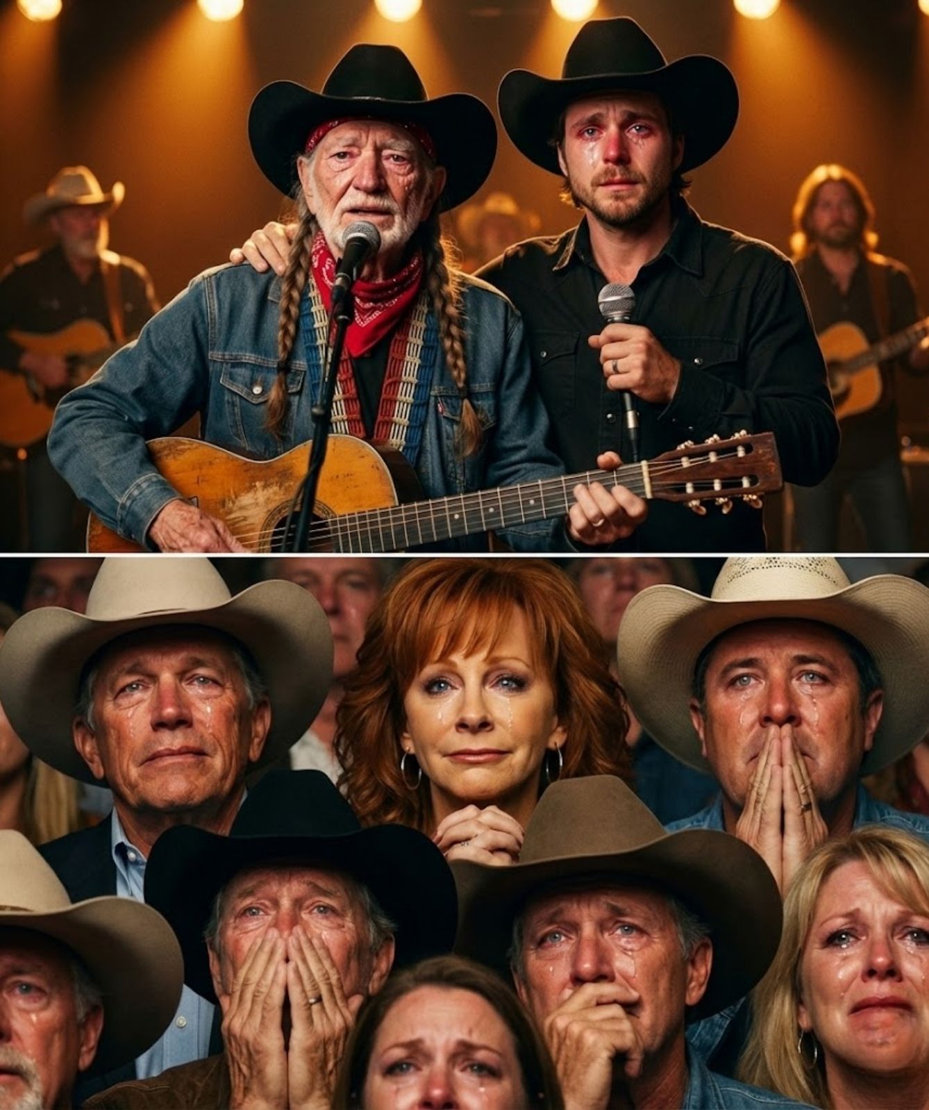 Lukas’s guitar began to cry—not loudly, but beautifully. Its sound drifted like a Texas sunset, soft, golden, and impossibly gentle. Each note carried warmth rather than weight, sorrow softened by hope. Willie’s presence wrapped around the music like a familiar embrace, his phrasing carrying wisdom earned through living, not taught, not rehearsed.
