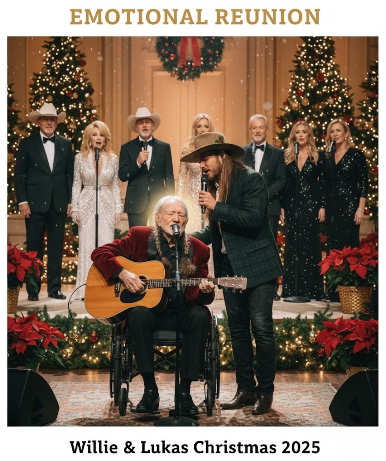 On Christmas Eve 2025, the lights inside the Grand Ole Opry dimmed to a gentle glow, the kind reserved for moments that ask for reverence rather than applause. Snow had settled quietly over Nashville, and inside the circle, time seemed willing to wait. When Willie Nelson stepped forward with his son Lukas Nelson at his side, the room understood—without a word spoken—that this was not an ordinary performance. It was a reunion, a benediction, and a passing of light.
