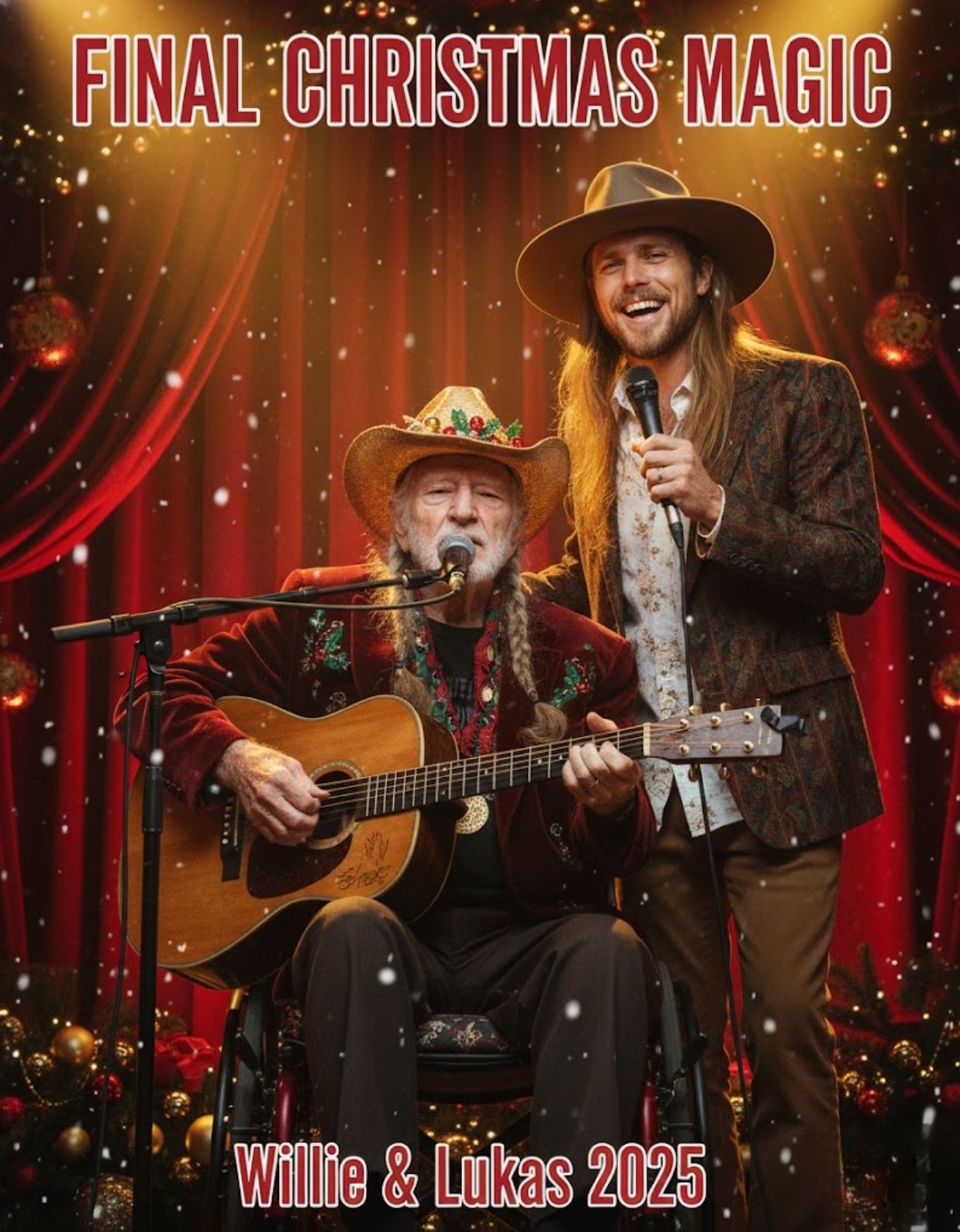 There are moments in music that feel planned, rehearsed, and perfected — and then there are moments that arrive like a blessing, unannounced and overwhelming, leaving everyone present forever changed. On a sacred Christmas night in 2025, the latter unfolded when Willie Nelson stepped onto the stage beside his son Lukas Nelson, offering a duet that did not merely entertain, but stilled time itself.