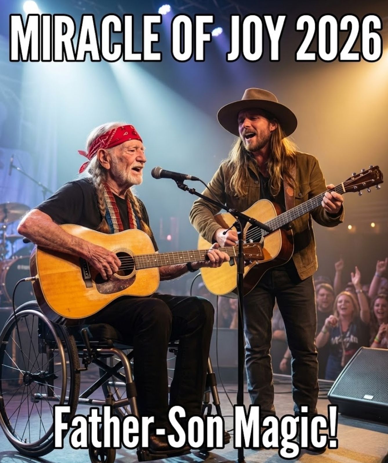 When they began to sing together, something rare happened. Willie’s voice—weathered, unmistakable, and still steady in its honesty—wrapped gently around Lukas’s, which carried strength and clarity shaped by a different generation. It was not about precision. It was about connection. Their voices did not compete. They leaned into one another, blending like sunlight over open Texas land, familiar and eternal.