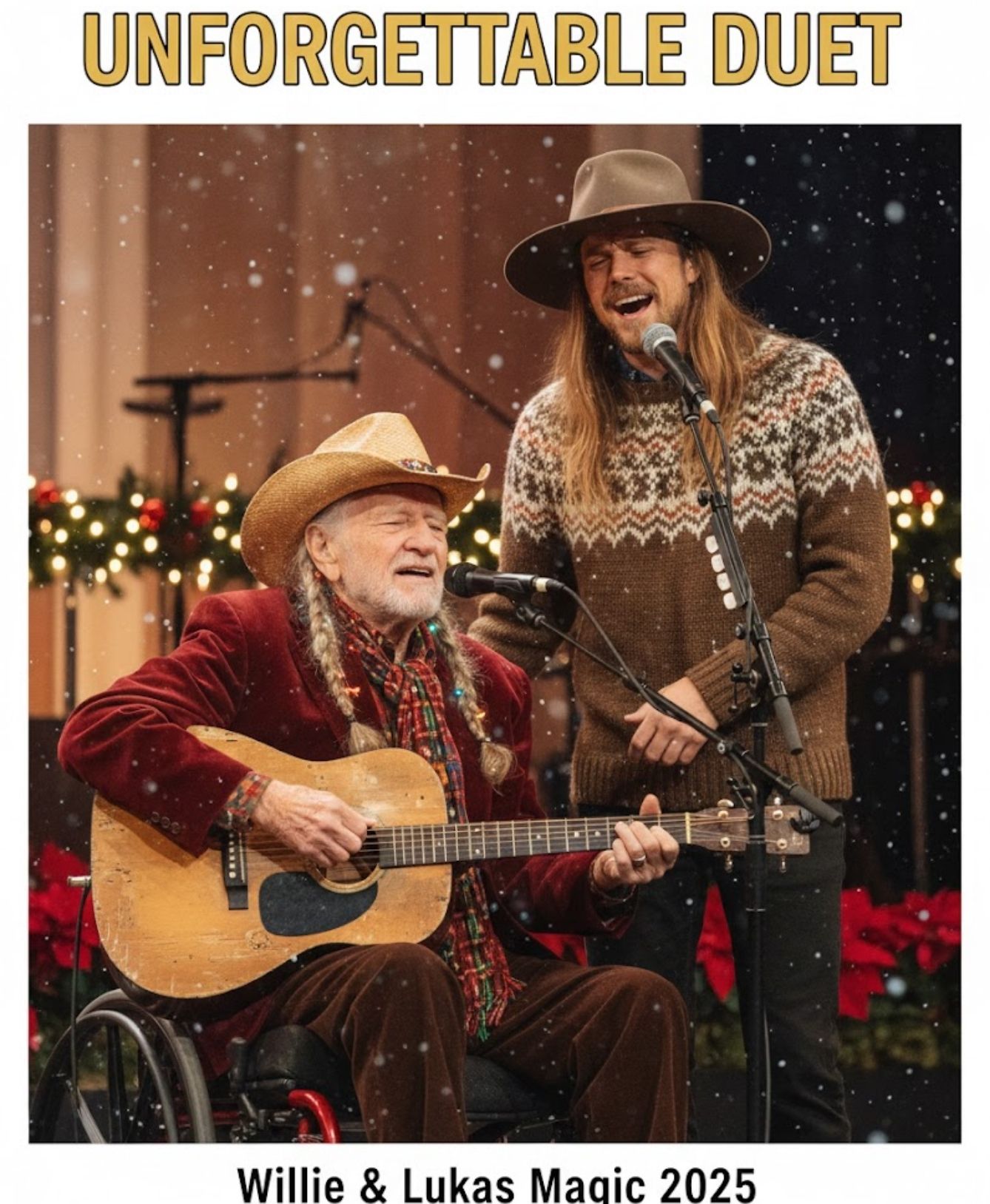 There are nights when music stops behaving like music. It becomes memory, blessing, and inheritance all at once. Christmas Eve 2025 was one of those nights, when Willie Nelson stepped into the sacred circle of the Grand Ole Opry with his son Lukas Nelson, and offered the world a duet that did not ask to be remembered—yet will never be forgotten.